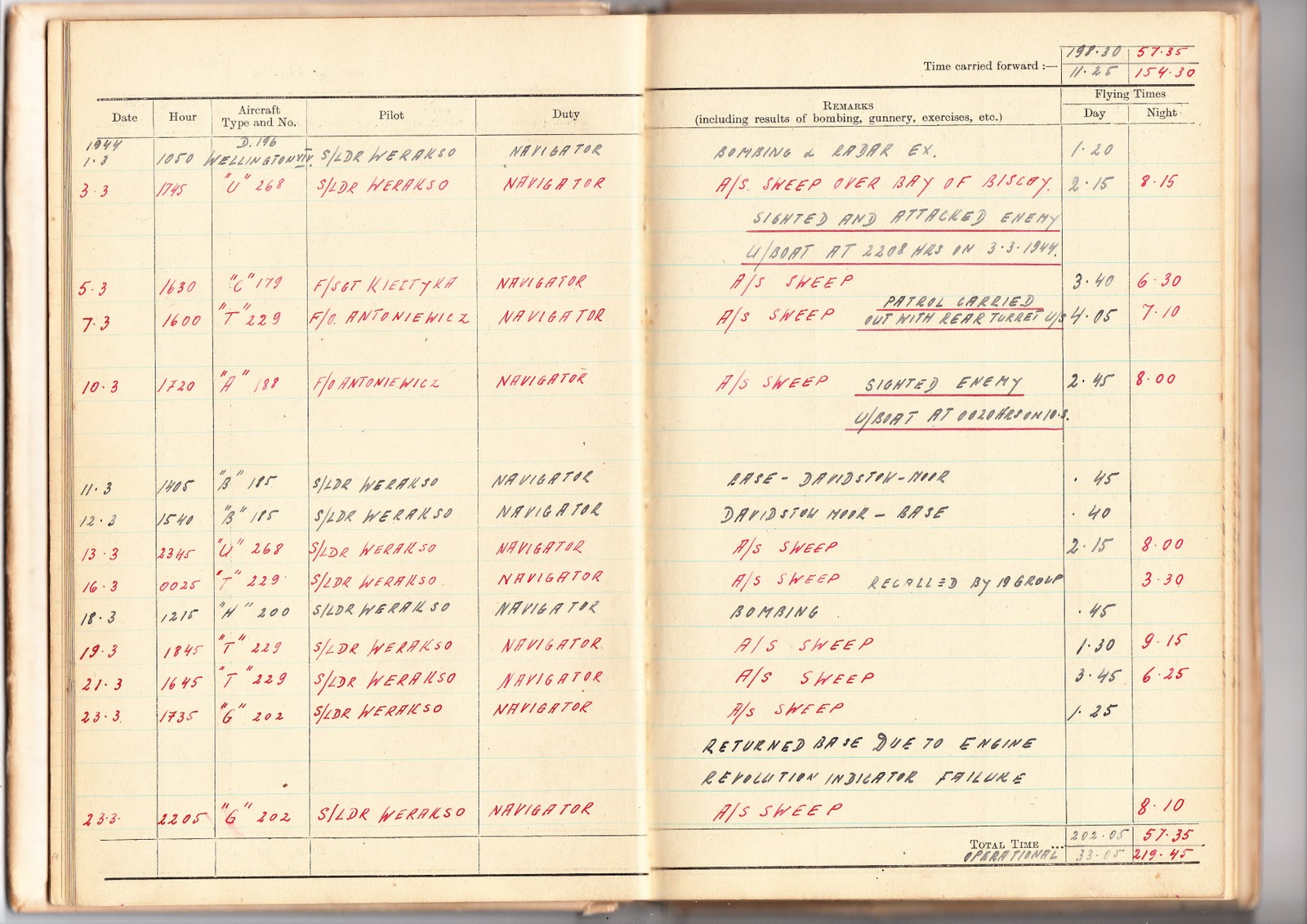 A year later, in spring 1942 he was sent to RAF Hucknall in Nottinghamshire where he had to qualify on Tiger Moths with only 12 hours flying time. However, operational needs changed and although he had qualified as a pilot, he had to retrain as a navigator, which he did at the Navigator School in Eastbourne, Sussex, finishing off at RAF Jurby on the Isle of Man in the autumn of 1942 before being posted to Coastal Command and further operational training with 1OTU at RAF Silloth, Cumberland (now Cumbria). Finally, he became part of an aircrew and in the summer of 1943 they were posted to 304 Squadron at RAF Davidstow Moor in Cornwall. During his service, he was awarded the Cross of Valour on four occasions. He was part of the regular crew of Wing Commander Jozef Werakso and, on the night of 3/4 March 1944, they attacked a surfacing U-boat which immediately dived. The British Admiralty claimed the boat was sunk but no confirmation was found in records after the war. A week later they sighted another U-boat but did not attack it.